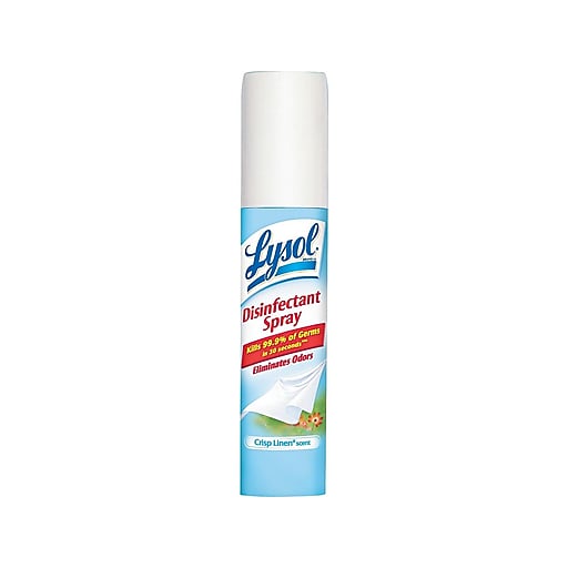 Lysol spray to go. Spray 3 to 4 seconds until covered with mist. The Crisp Linen scent keeps rooms smelling fresh and clean while the compact size lets you conveniently carry this disinfectant in a purse or backpack. This means that they are too large to take in your hand luggage because liquids need to go in your liquids bag.