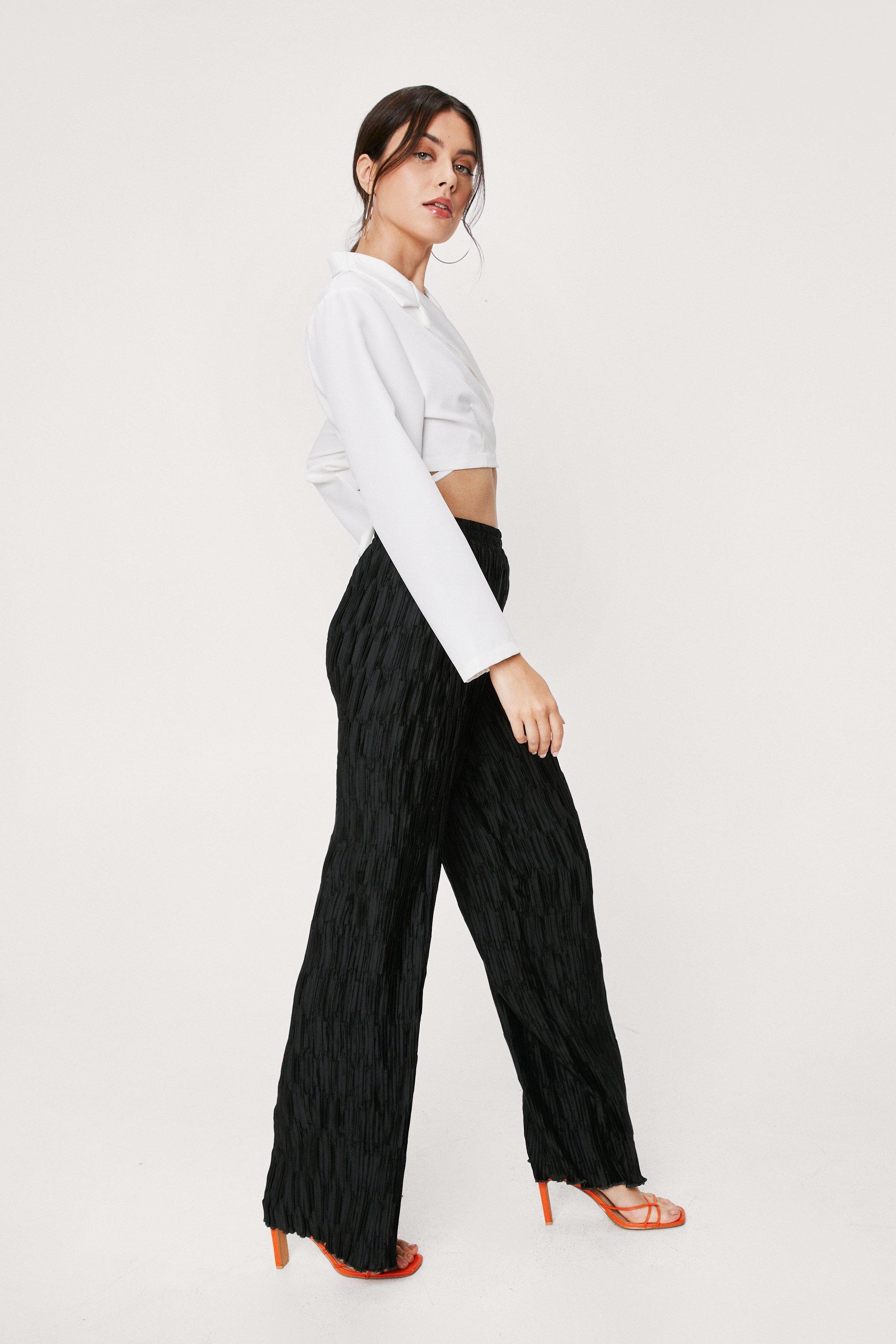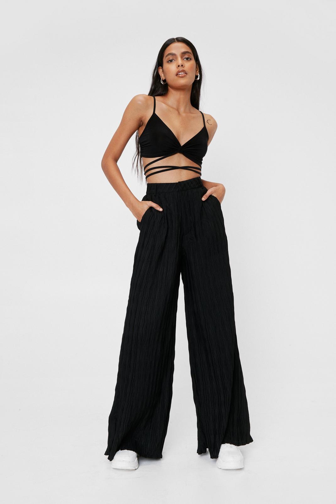These bottoms are perfect for day-to-night dressing. Regular fit wide leg with heels - sits just off the floor in heels 100 polyester noara wears a UK size 8 EU size 36 US size 4 and her height is 59. Featuring a black plisse material with a high waisted fit and a wide leg design whats not to love.