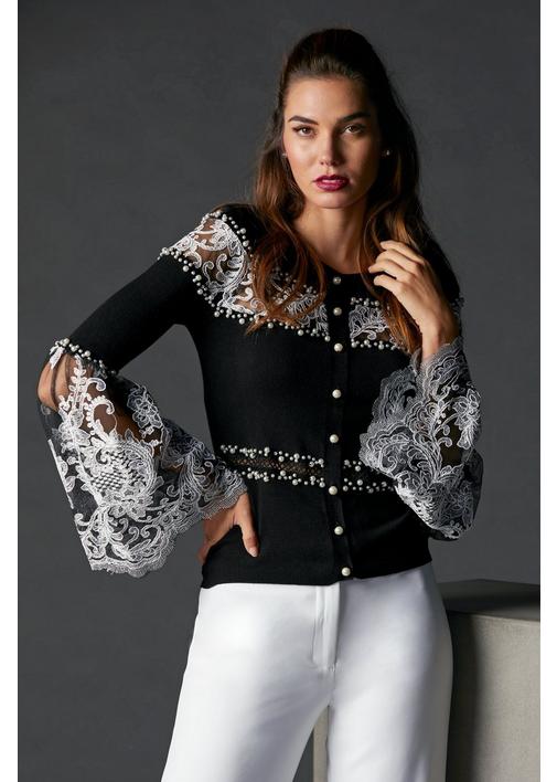 Pearl embellished cardigan sweater. 2 WAIST Bend to one side and find the crease. Layered with opulent pearl and shimmering sequin embellishment the must-have long cardigan sweater of the season is super plush and luxurious for those days and nights when you want to glitz up your style. 1 BUST Stand naturally.